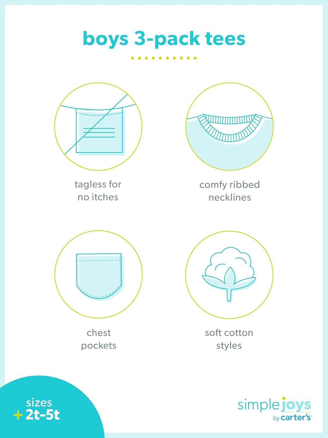 The Simple Joys by Carter's 3-Pack Long Sleeve Shirts for toddler and big kid boys offer a perfect combination of comfort, style, and practicality for everyday wear. Designed to keep up with active kids, these shirts come in a variety of fun prints and vibrant colors that make dressing easy and enjoyable. Whether you're getting ready for a day of play or layering up for cooler weather, these shirts are a versatile choice for any wardrobe. Each pack includes three long-sleeve shirts, each featuring a unique design—ranging from playful patterns to bold colors, offering a mix that suits any personality. These shirts are made from soft and breathable fabric, providing all-day comfort for your little one while allowing for easy movement during playtime or school activities. The shirts feature a classic fit, with long sleeves that provide warmth and coverage. The simple, pullover design makes them easy to get on and off, while the tagless construction ensures there’s no itching or irritation at the neck.