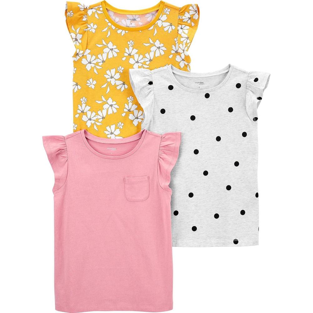 Simple Joys by Carter’s Girls Short-Sleeve Shirts and Tops, Pack of 3(Grey Polka Dot/Pink/Yellow Flowers)