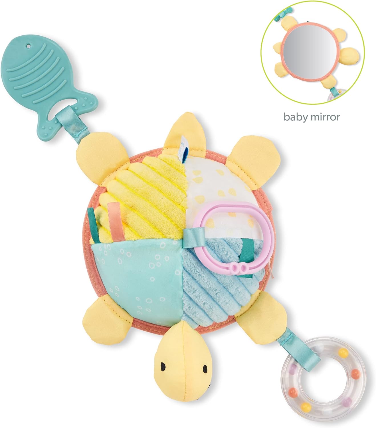 Offering multisensory play for baby, our cute turtle activity toy engages baby with multiple textures, a sweet chime sound, a rattle ring, teether toy and a baby mirror on the turtle’s tummy. Perfect for at home play or on-the-go—just attach it to your stroller with the included clip.